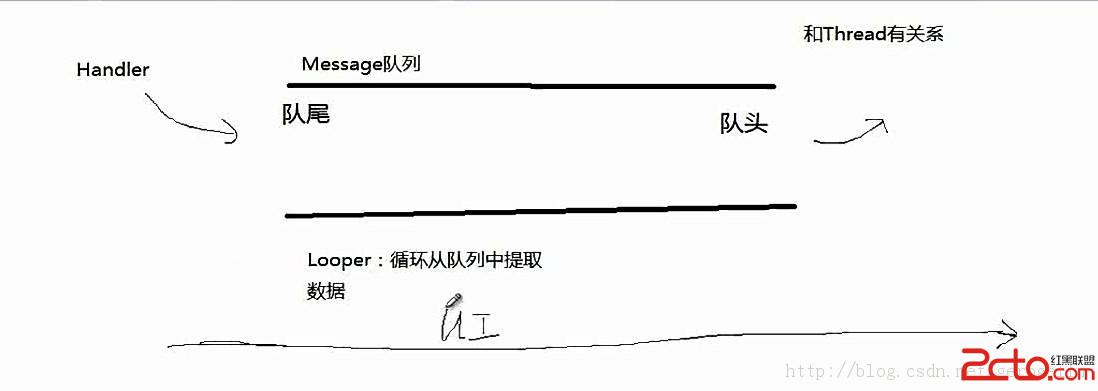 如圖所示,Handler負責將數據壓棧到Message隊尾中,並從隊頭取出數據,而Looper負責從隊列中進行循環取出,得到Handler的數據。注意Looper必須是UI的Looper,我們才能對UI界面進行更新!
