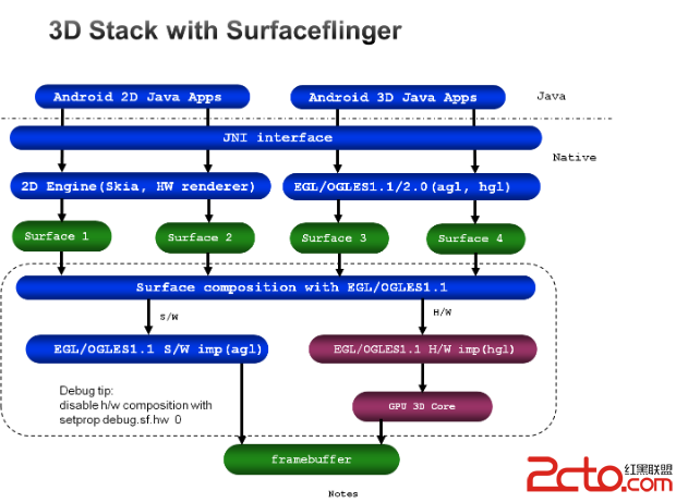 以前Android是使用skia生成2D圖形的,後來(4.1 Jellybean )為了提高性能,改為使用 opengl (因為可以可以gpu),但以前的skia軟架構依舊保留