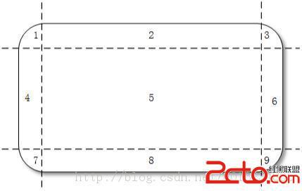 對NinePatch圖縮放時,圖片中1,3,7,9四個角保持不變。2號和8號區域水平縮放,4號和6號區域垂直縮放,5號區域則全縮放。