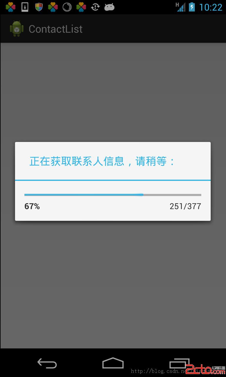 在本篇的代碼中,主要是在獲取聯系人信息代碼的基礎上加上了一個ProgressDialog。代碼比較簡單,就不仔細說明了,下面看代碼: