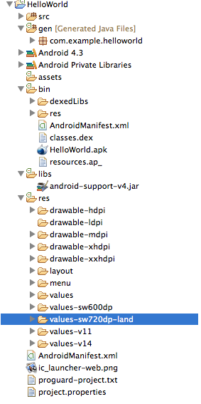 1、src:java源碼文件,自己寫的。2、gen:自動生成的java文件,包名與主包名一致,ADT裡自動生成的。(1)BuildConfig:配置文件,不能更改(2)R
