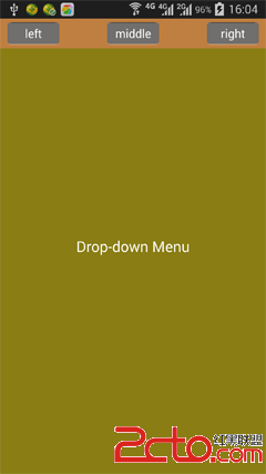1.概述 本文將介紹如何利用PopupWindow實現點擊屏幕頂部工具欄按鈕彈出下拉菜單的功能。先上圖: 2.代碼實現 首先是activ