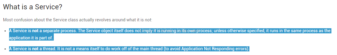剛開始學習Service的時候以為它是一個線程的封裝,也可以執行耗時操作。其實不然,Service是運行在主線程的。直接執行耗時操作是會阻塞主線程的。長時間就直接ANR了