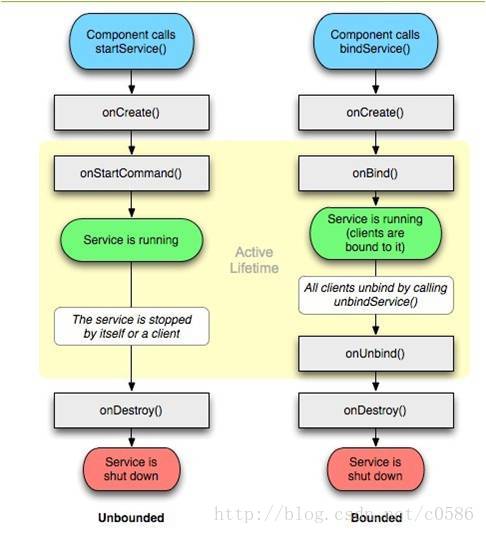 使用bindService()啟動的服務與調用者(Context)綁定,只要調用者關閉服務就終止,使用此方法啟動時,服務首次啟動系統先調用服務的onCreate()–>onBind(),如果服務已經啟動再次調用不會再觸發這兩個方法,調用者退出(或不存在)時系統會調用服務的onUnbind()–>onDestory(),想主動解除綁定可使用Contex.unbindService(),系統依次調用onUnbind()–>onDestory(),