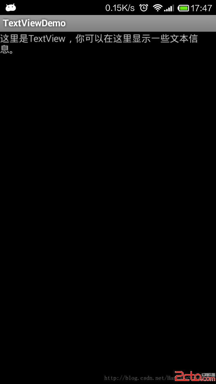 TextView是Android裡面用的最多的UI組件,一般使用在需要顯示一些信息的時候,其不能輸入,只能初始設定或者在程序中修改。 實例:TextViewDemo