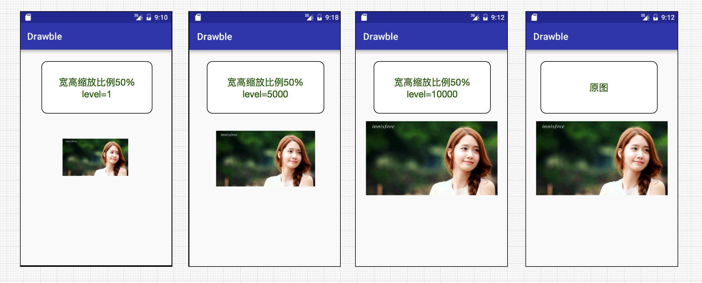 ??我們再來對比一下寬高同等縮放比例(50%)下,level對Drawable的影響效果,分別設置level等級為1,5000,10000.