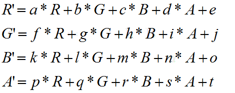 為什麼要使用4*5矩陣而不是4*4矩陣?。因為只有4*5矩陣可以單獨改變一種顏色值。比如你改變e,只會影響R’。