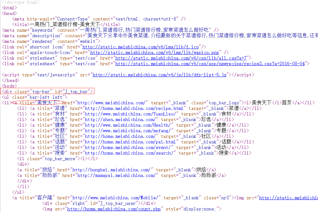 找到需要的,例如上圖這個 “美食天下” ,可以看到 “美食天下” 是放在以 <div class="top-bar" id="J_top_bar"> 為節點的 <a title="美食天下" 中,要獲取這個“美食天下”,代碼可以這樣寫: