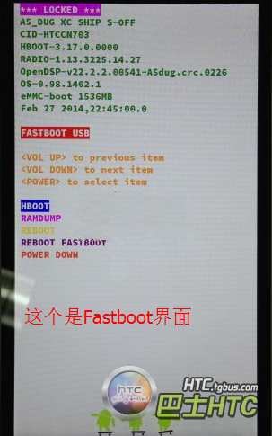 1、手機進入fastboot界面。把你的手機先關機,在你的手機關機狀態下,按住手機“音量下鍵”和 “電源鍵”(兩鍵一起按數秒)開機進入HBOOT界面,然後再按一下電源鍵,進入fastboot模式,此時連接電腦,手機屏幕顯示 fastboot usb,這個時候手機就不要動了。