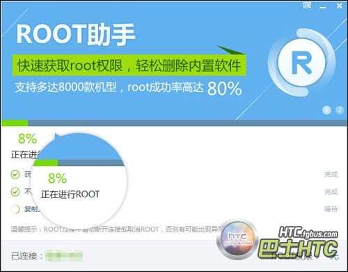 1、將自己的手機如HTC Magic連接電腦,安裝好已下載的ROOT助手,打開ROOT助手,等待ROOT助手連接手機。