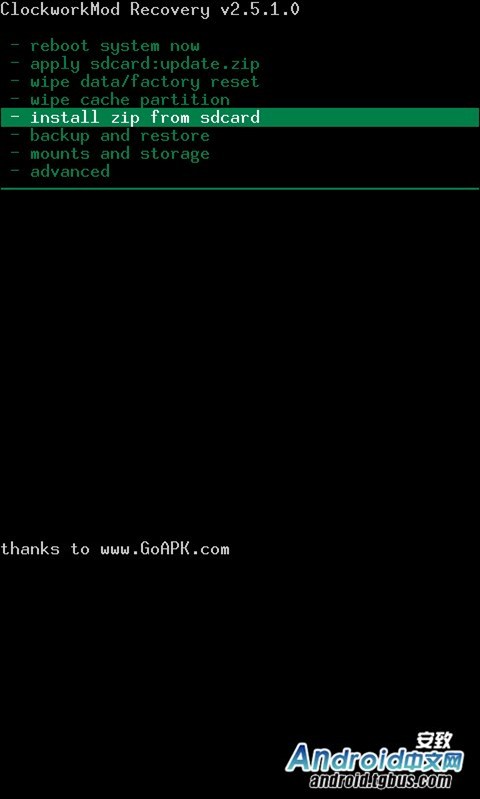 5、按音量下,選擇Install zip from sdcard,按觸控板中鍵確定進入,按電源鍵返回