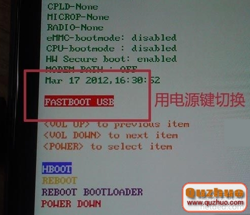 1:把手機關機,然後在關機狀態下按住手機的 音量下鍵 和 電源鍵 進入HBOOT模式,然後按音量鍵選擇FASTBOOT,然後按電源鍵確認,進入FASTBOOT界面
