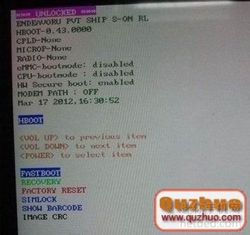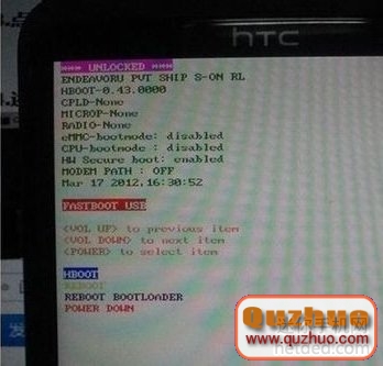 2:然後手機開機,進入fastboot,進入的辦法:一起按住音量上下鍵 + 電源鍵,等幾秒重啟,黑屏後敏捷按住音量下和電源鍵,進hboot,音量上下是移動,電源鍵是挑選鍵,移動到fastboot,按下電源鍵就進入fastboot了