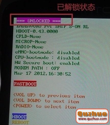 7:手機端操作上圖內容後,即可完結解鎖,進入HBOOT後如下圖,一切過程完結