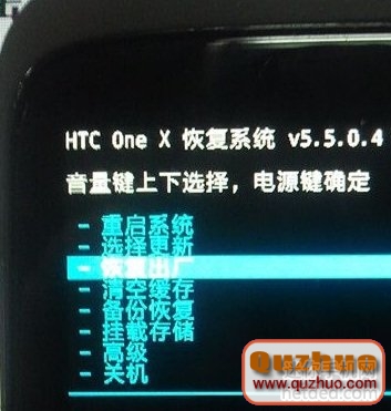 2:然後按住音量鍵下 + 電源鍵 進入hboot界面,用音量下鍵挑選“recovery” 項,按音量鍵承認挑選recovery項,進入recovery 這兒運用的是中文recovery 英文的請相應對照翻譯。(注:此界面下 “音量”鍵 為上下挑選鍵。“電源”鍵為承認鍵)