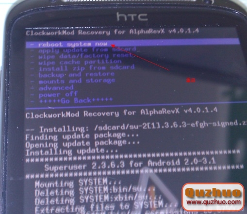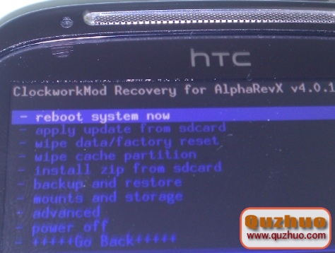 1:手機關機,然後音量減鍵和開機鍵一向按著進入HBOOT界面,音量鍵挑選Recovery,然後電源鍵承認,手機重啟進入Recovery形式