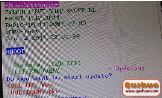 4:當我們進入HBOOT後,會自動提示更新Recovery(留意:中文版的能夠有所不同,中文版的話手機檢測到PG58IMG.zip,問詢是不是晉級,按音量上挑選Yes就行了),這時我們按音量鍵+開始刷Recovery,在寫入Recovery的過程中不要關機,大約30秒左右就可以完成了,如下圖