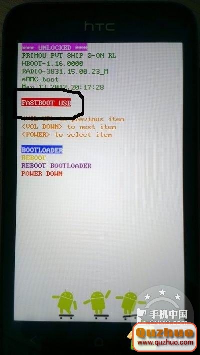 3.按下電源鍵切換到fastboot界面,並且可以看見紅框的“FASTBOOT USB”字樣
