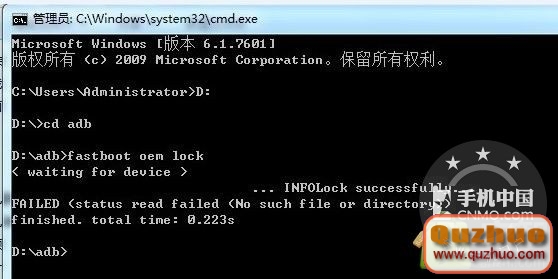 出現DOS窗口後,接著輸入“D:”接著再輸“CD ADB”接著再輸:“fastboot oem lock”回車