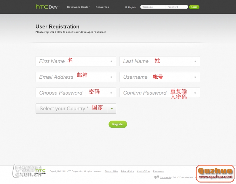 1、首先到HTC官方網站進行注冊一個賬號,(網址:http://www.htcdev.com,如果已經注冊能夠疏忽這一步),進入注冊頁面今後找到頁面上方的“Register”按鈕,點擊進入進行注冊,填寫好有關材料按過程進行就能夠了;