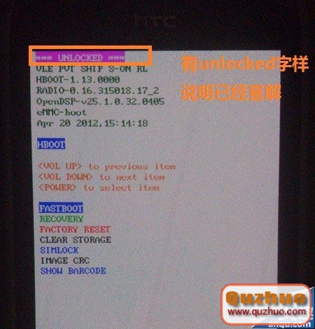 讓入手的HTC ONE S為斷定狀態,按住【電源鍵】和【音量減鍵】進入HBOOT界面,隨後可以看到在首行顯現的為locked字樣,解鎖結束後則為unlocked字樣。