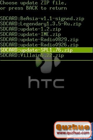 8、此刻你的手時機呈現RA的Recovery,這個辦法即是經過www.shuleba.com電腦端在手機中樹立一個Recovery的鏡像,這個鏡像能夠在後邊的過程中幫你刷 SPL為S-OFF。此刻你能夠進入Flash zip from sdcard,找到你現已放入SD卡根目錄下的SPL unlocked包。經過軌跡球操作,挑選後,按HOME鍵(斗室子鍵)表明斷定,此刻就開端刷SPL了,刷好後挑選Reboot system now就能夠重啟推出RA的Recovery鏡像。