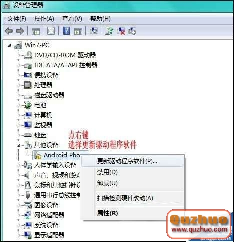 4.接著在【設備管理器】界面中,如下圖的能夠看到一個帶著感歎號的設備。右鍵挑選【更新驅動軟件程序】。