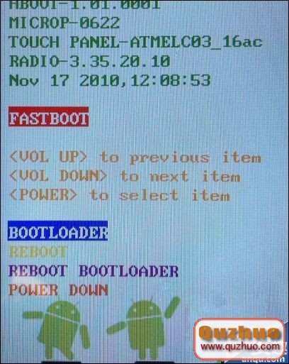 3、重啟手機(扣電池),進入fastboot模式(就是按住音量下鍵+開機鍵,手機左上角出現一堆英文,即代表進入hboot模式,再按電源鍵進入fastboot模式);