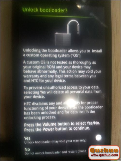 7.然後一鍵解鎖會自動為你解鎖,當解鎖成功後,手機會出現下圖這個畫面讓你選擇,用音量鍵選擇YES,電源鍵確認,就解鎖成功了!