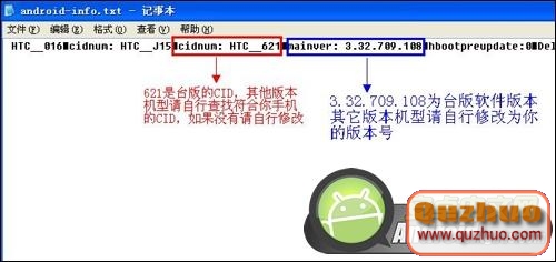 6、直接雙擊打開附件二(不要解壓縮,直接雙擊打開即可),找到名為android-info.txt的文件並雙擊打開,打開以後查看是否有和你記錄下的CID一致的,如果沒有請將任意CID修改為你剛剛記錄下的CID,修改好CID以後找到“mainver”,mainver後面的數字就是軟件版本,請將其修改為對應你手機軟件版本的相應數字,修改好以後保存並關閉編輯窗口,提示文件內容已修改,是否更新文件時點擊確定即可。