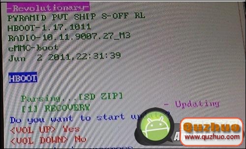 4:當我們進入HBOOT後,會自動提示更新Recovery(注意:中文版的可能有所不同,中文版的話手機檢測到PG58IMG.zip,詢問是否升級,按音量上選擇Yes就行了),這時我們按音量鍵+開始刷Recovery,在寫入Recovery的過程中不要關機,大概30秒左右就可以完成了,如下圖