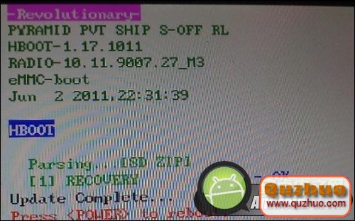 5:Recovery寫入完畢後,按關機鍵關機,然後開機重啟,提示如下圖: