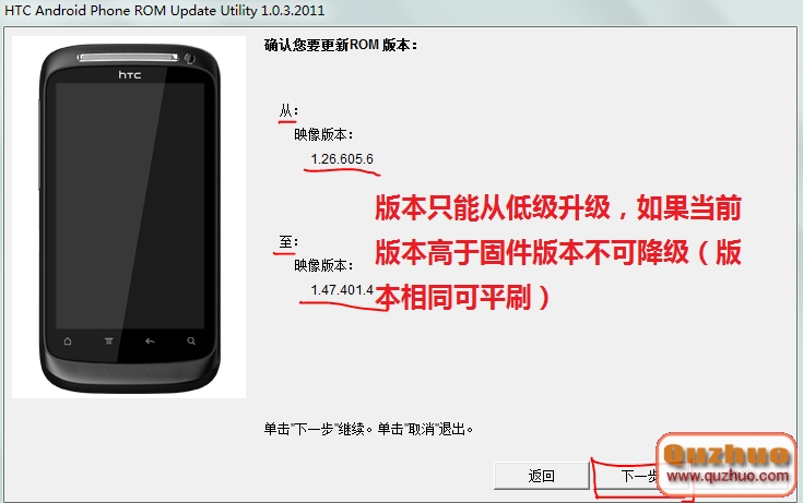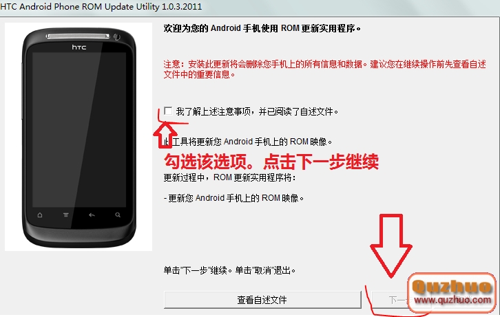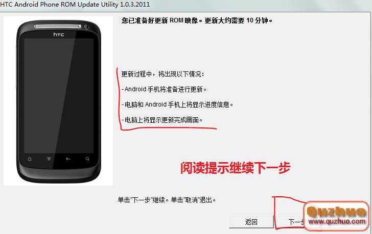3、然後手機通過數據線連接www.shuleba.com電腦,在www.shuleba.com電腦上打開*.exe格式的RUU固件,打開後按途中提示操作。如下: