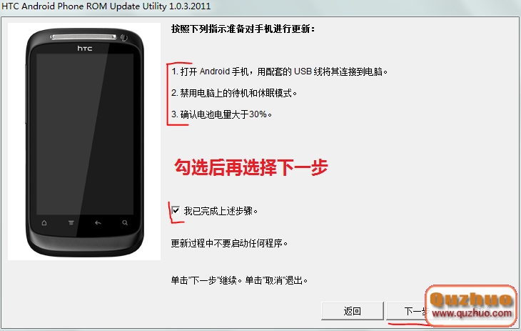 4、閱讀提示後繼續下一步。如果電池電量過低軟件會提示不能刷機。