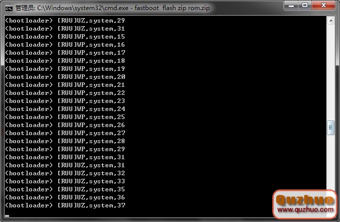 3、將下載來的官方zip格式包放入adb文件夾內,在打開命令窗口輸入:fastboot flash zip rom.zip。rom.zip為刷機包名字!輸入命令後會看到光標閃動,等待幾分鐘後軟件會反饋信息。如圖: