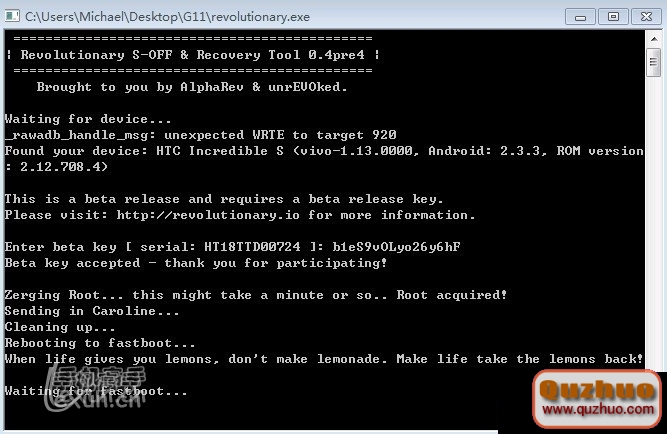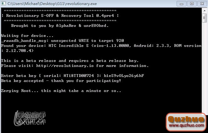 4.在www.shuleba.com電腦上解壓縮revolutionary 文件包,並運行revolutionary.exe程序。切記,一定要打開“設置-應用程序-開發-USB調置”。在運行revolutionary後,能正確連接你的手機,此時畫面會顯示你的手機型號,HBOOT版本,S/N,將會出現如下界面: