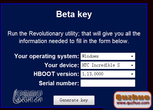 就會彈出一個獲取KEY的畫面,選擇你手機的型號.HBOOT版本(選擇1.13),輸入你的手機的S/N碼後(進設置->關於手機->設備信息->設備序列號):