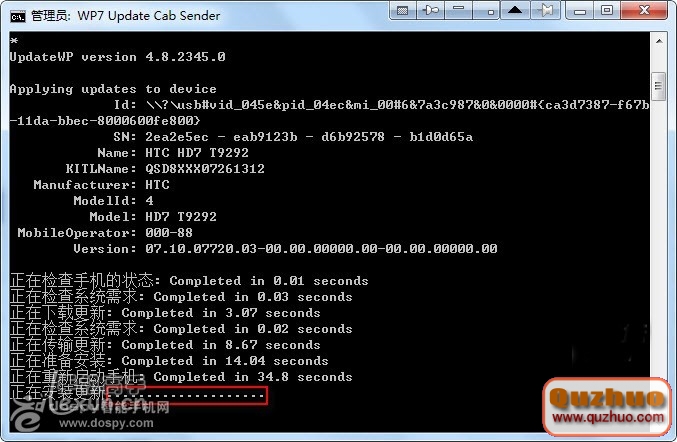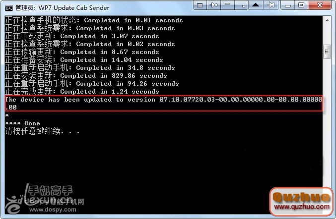 更新完畢後會提示重新啟動手機,這個時候仍然不要關閉程序和拔掉數據線,直到顯示The device has been updated to version……Done了才算大功告成。