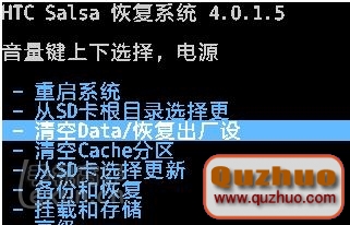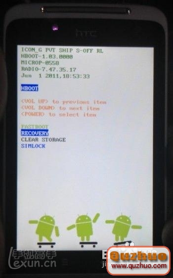 2、進入HBOOT這個界面按一下音量下鍵選擇第二項Recovery按開機鍵確認,手機會重啟進入中文Recovery如下圖