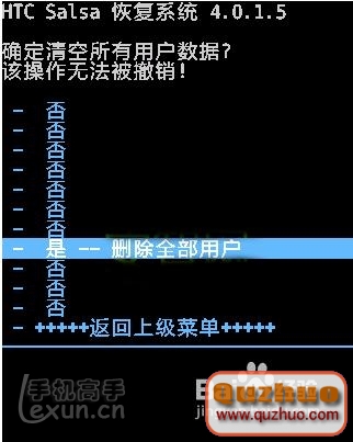 4、使用音量鍵選擇:是 -- 刪除全部用戶 按開機鍵確認開始清空 如下圖