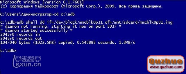 先輸入:adb shell回車,這時會顯示一個“$”符號,然後在輸入:su回車,這時手機的“權限管理”會彈出授權提示,通過授權,提示符會變成“#”表示已經取得最高權限。第三步輸入:dd if=/dev/block/mmcblk0p31 of=/mnt/sdcard/mmcblk0p31.img回車,這時一般就不會報錯,提取成功;