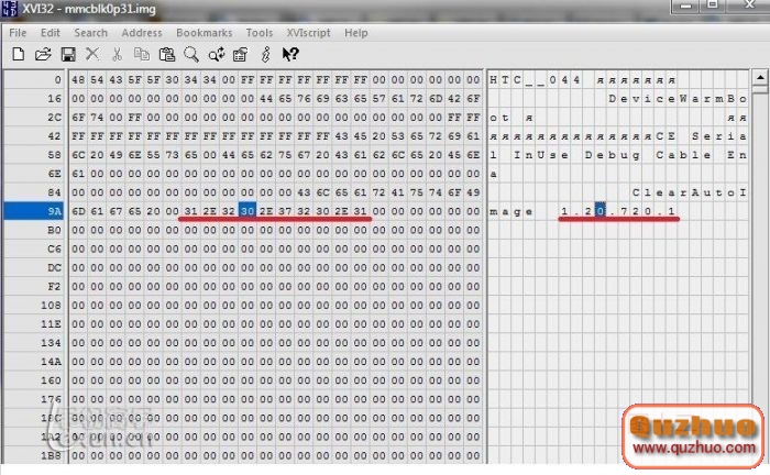 四、不要關閉命令窗口,再一次把手機由“僅充電”模式切換為“磁盤驅動器”模式,略等半分鐘,運行剛才下載的XVI32.exe,打開內存卡上的mmcblk0p31.img,在xvi32中修改你的ROM版本號為1.20.401.2,其他都不要改動,如圖十一、十二(本例為1.22.720.1修改為1.20.401.2),保存