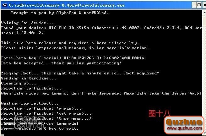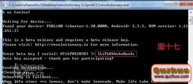 四、打開手機的調試模式,選擇“僅充電”,運行剛才下載的破解工具revolutionary.exe,最後一行左邊會顯示您的手機S/N碼,右邊光標處,輸入剛才從網站上獲取到的破解驗證碼(圖十七)。