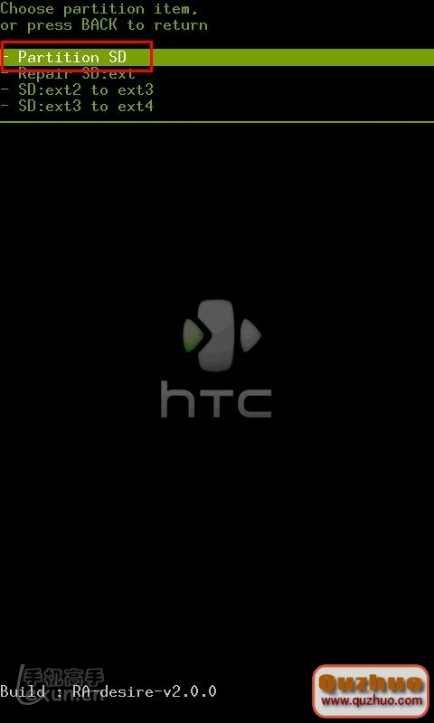 2、滑動光感鍵,選 Partition sdcard 進入SD卡分區界面。