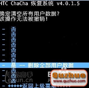 4、使用音量鍵選擇:是 -- 刪除全部用戶數據 按Enter鍵確認開始清空 如下圖