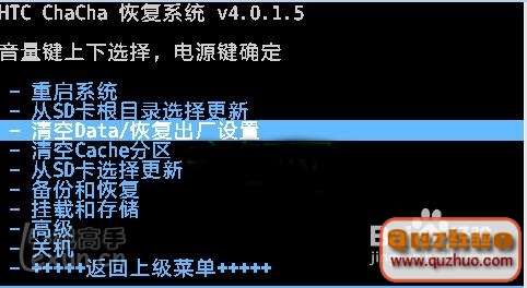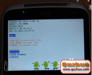 2、進入HBOOT這個界面按一下音量下鍵選擇第二項Recovery按開機鍵確認,手機會重啟進入中文Recovery如下圖