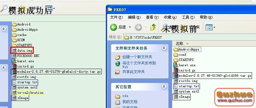 (一)圖中的紅色data.img,這個是模擬成功後生成的安卓虛擬內存。裡面包含了模擬成功後所有文件跟軟件,這個就跟玩虛擬機生成的虛擬硬盤類似的,這個就是為什麼非分區版的會比分區版跟cmw慢的關系,而且如果你內存卡不好或者有些系統錯誤就很不容易模擬非分區的安卓,這個就不再說明了。