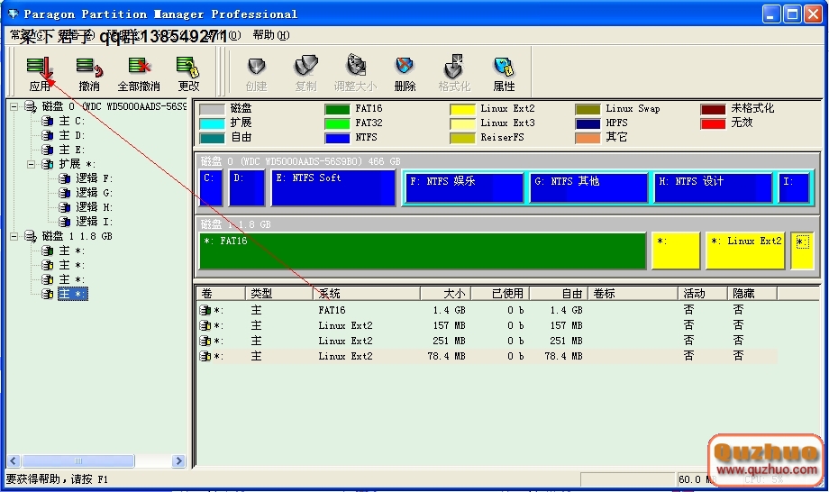 最後點確定,用同樣的方法完成其他兩個ext2的分區,最後點右上角的應用,pm就會完成分區工作了