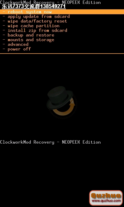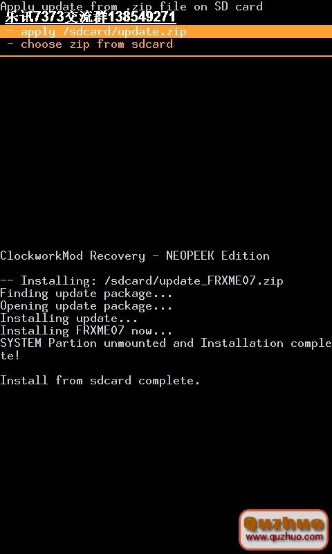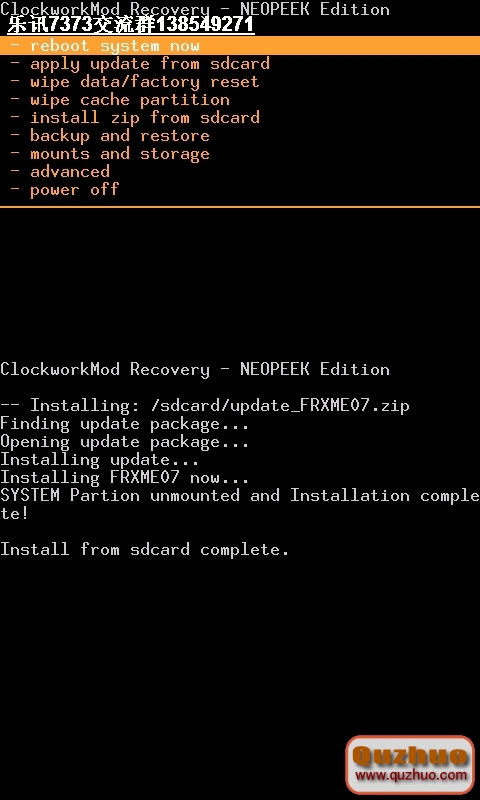 當跳出install from sdcard complete.就是rom安裝完成了,然後按返回鍵,返回到最初的界面,在選擇reboot system now,手機重啟