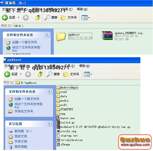 然後把下載好的cwm解壓出來,會有一個npkboot文件夾,把startup文件和內核拷貝進去,可以的話去下載一個較屏文件也放到npkboot裡面,再把整個文件夾拷貝到內存卡的fat32分區,把下載的rom拷貝到根目錄下,下面是內存卡根目錄與npkboot文件基本內容